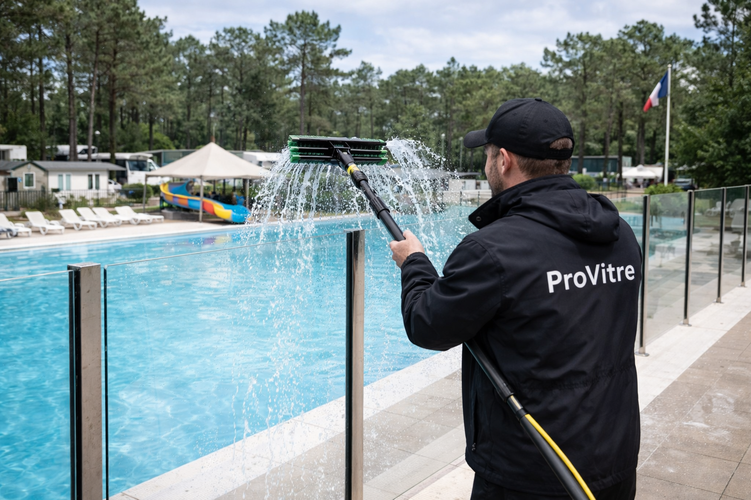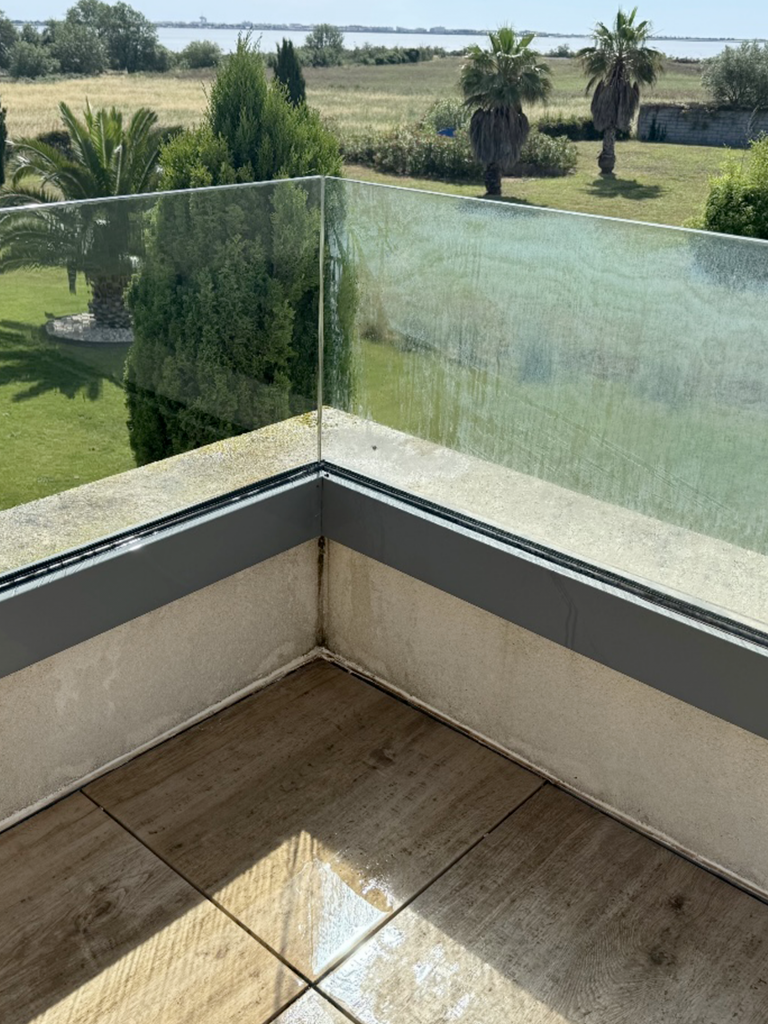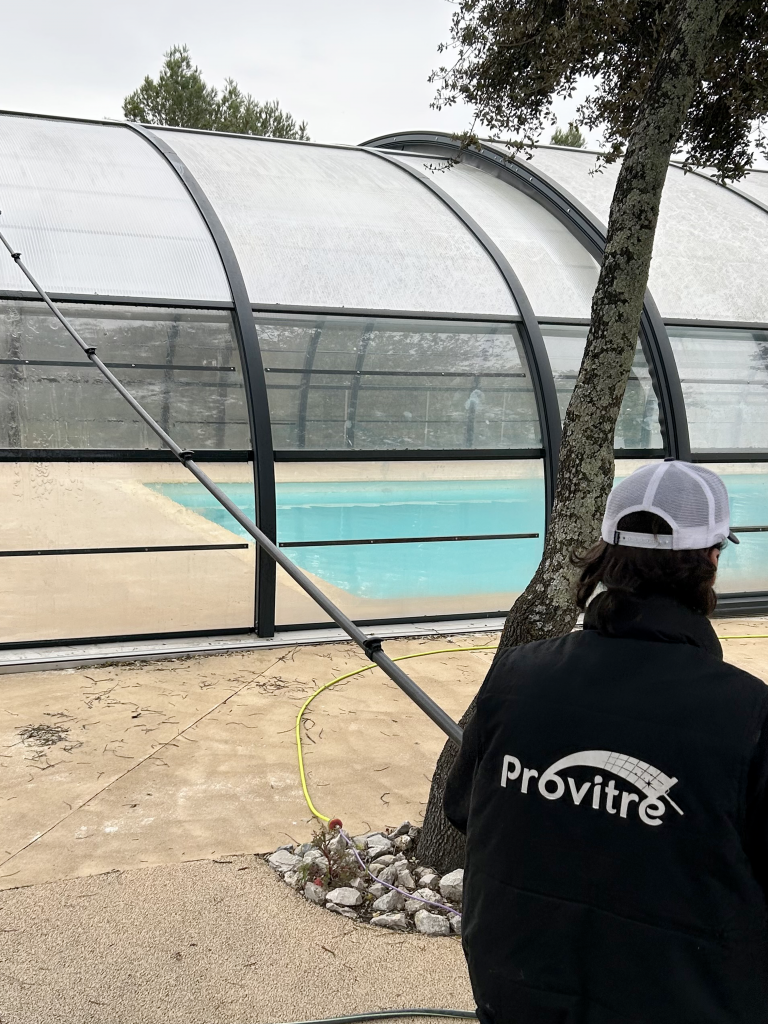 Idéal pour les vitres d’accueil, les espaces communs, les garde-corps de piscine, les dômes de piscine, vos bâches de pergola et autres surfaces lisses, ce procédé garantit un rendu impeccable tout en respectant les zones sensibles.