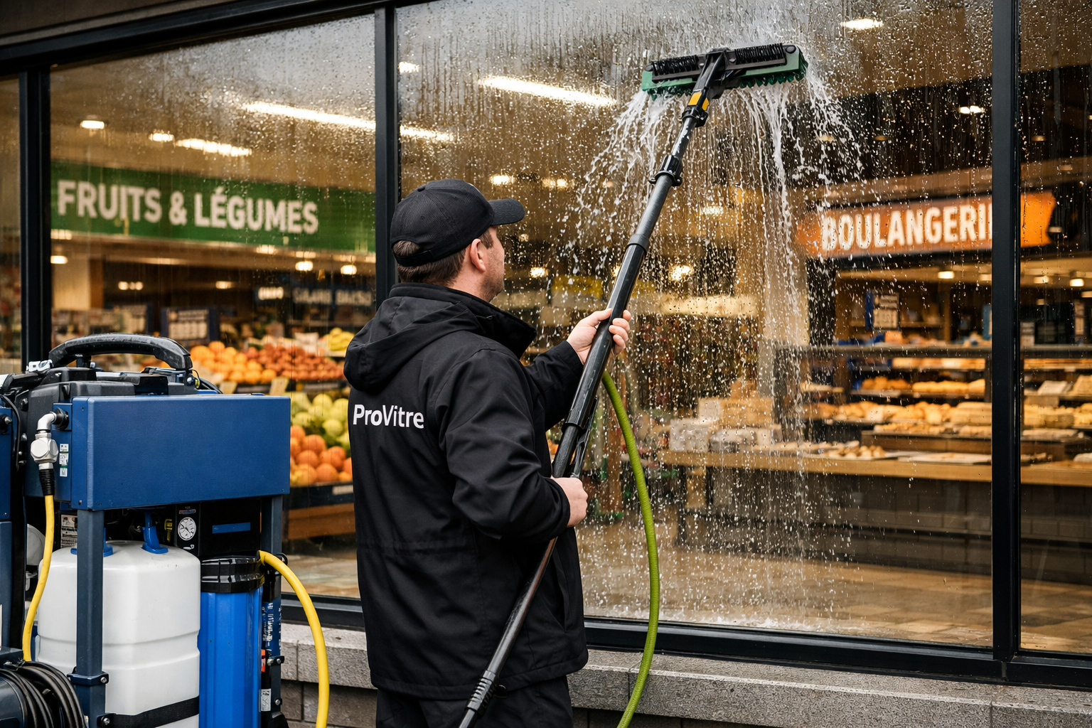Offrez à votre commerce une visibilité impeccable grâce au nettoyage à l’eau pure, une solution écologique et sans traces. Ce procédé utilise une eau filtrée et déminéralisée qui élimine efficacement saletés, poussières et résidus sans produits chimiques.