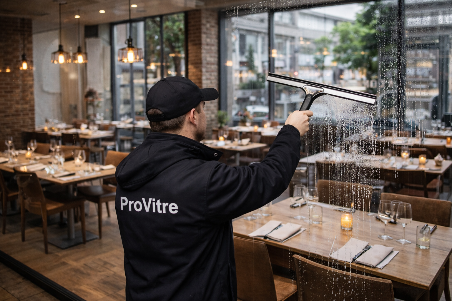 Idéal pour les vitrines, baies vitrées, terrasses vitrées et espaces d’accueil, ce procédé garantit un rendu impeccable tout en respectant les exigences d’hygiène des hôtels et restaurants.