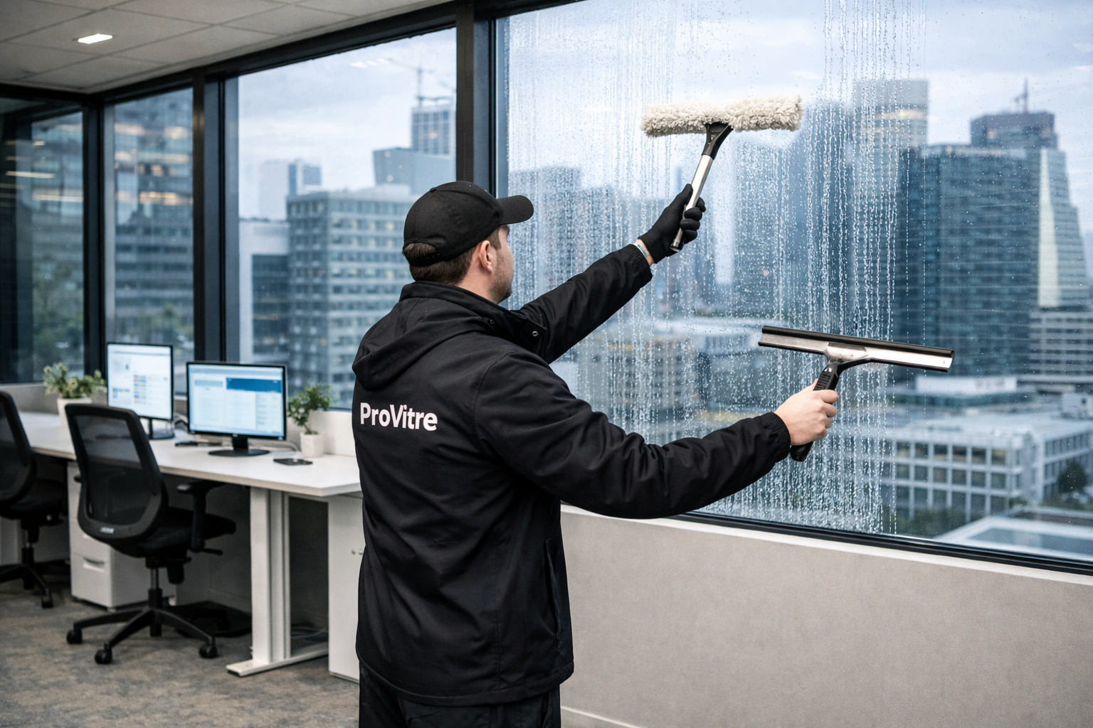 Apportez clarté et propreté à vos espaces de travail grâce au nettoyage à l’eau pure, une méthode écologique et sans traces. L’eau déminéralisée élimine efficacement poussières, marques et résidus sans utiliser de produits chimiques.